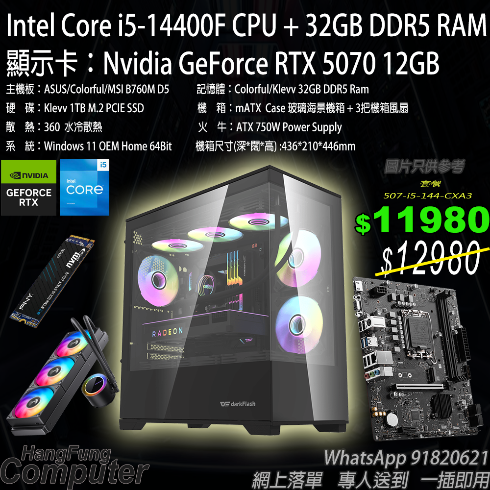 Intel i5-14400F, RTX 5070, 32GB DDR5 RAM, 1TB SSD 高階海景水冷電競系列