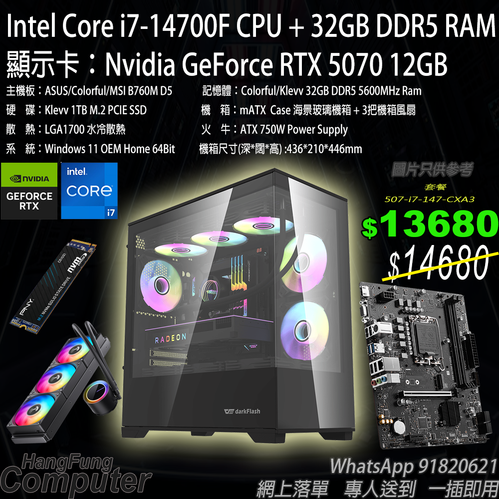Intel i7-14700F, RTX 5070, 32GB DDR5 RAM, 1TB SSD 高階海景水冷電競系列