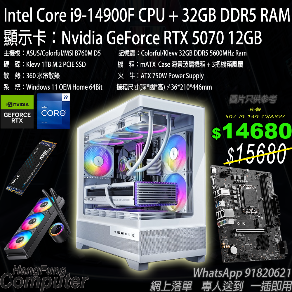 Intel i9-14900F, RTX 5070, 32GB DDR5 RAM, 1TB SSD 高階海景水冷電競系列