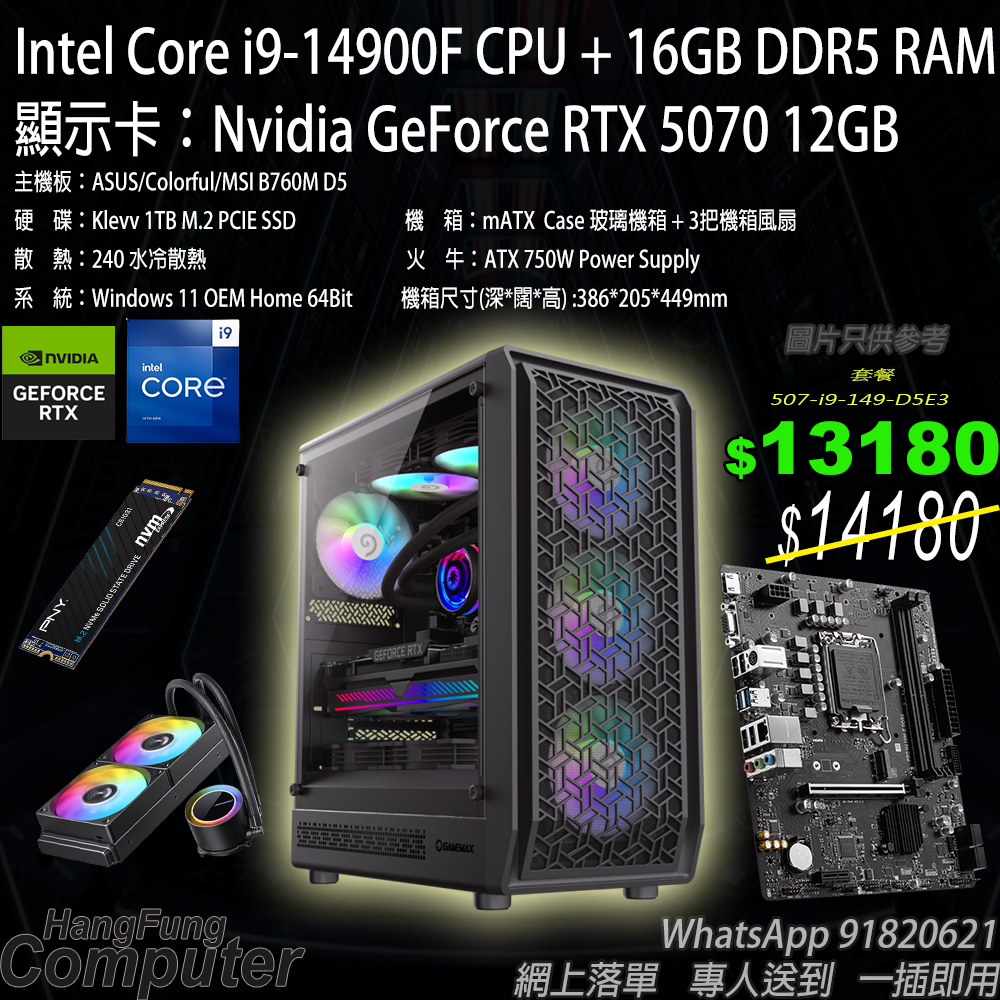 Intel i9-14900F, RTX 5070, 16GB DDR5 RAM, 1TB SSD 高階水冷電競系列