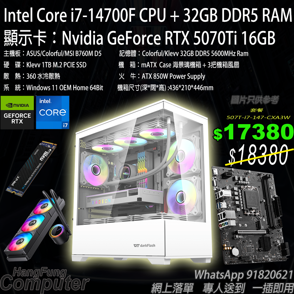 Intel i7-14700F, RTX 5070Ti, 32GB DDR5 RAM, 1TB SSD 高階海景水冷電競系列