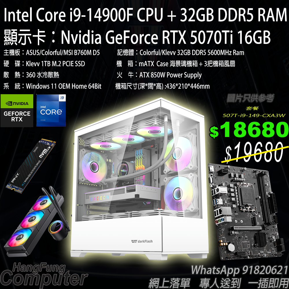 Intel i9-14900F, RTX 5070Ti, 32GB DDR5 RAM, 1TB SSD 高階海景水冷電競系列