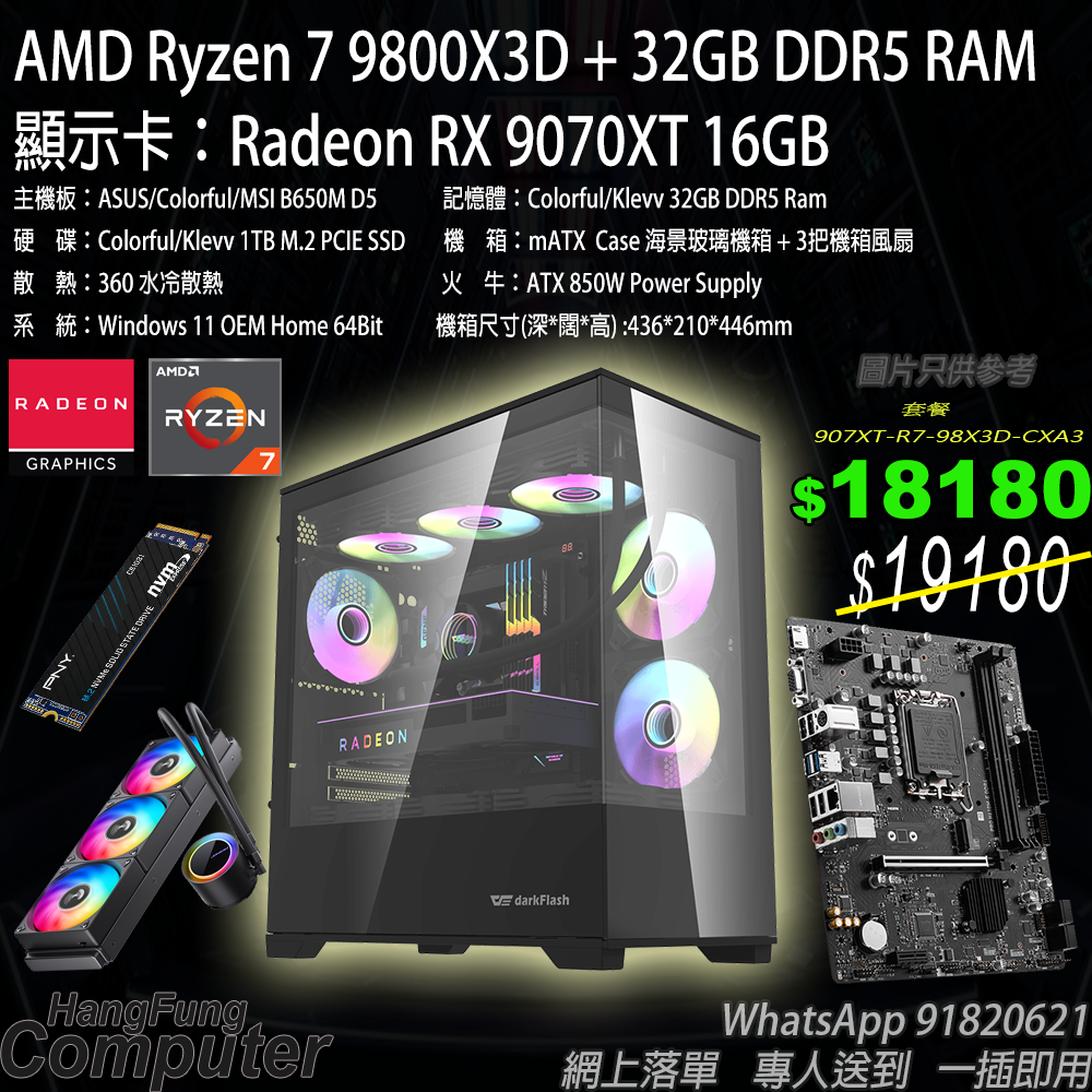 AMD Ryzen 7 9800X3D, RX 9070XT, 32GB DDR5 RAM, 1TB SSD 高階海景水冷電競系列
