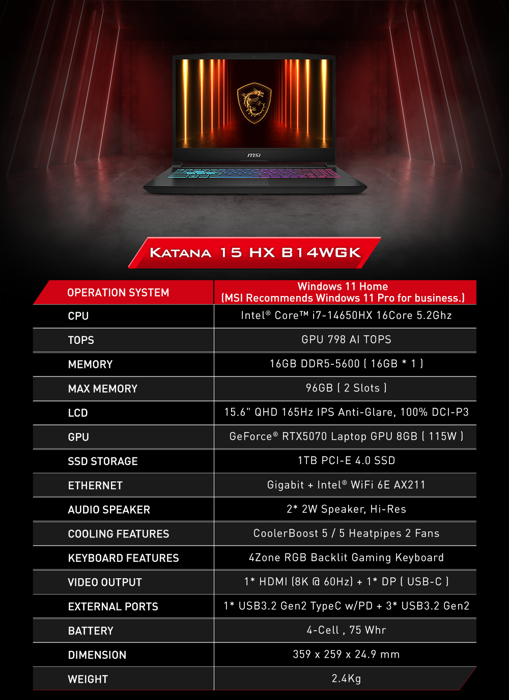 MSI Katana 15 HX B14WGK 15.6吋 (2025) (165Hz, i7-14650HX, 16GB+1TB SSD, RTX5070) 電競手提電腦