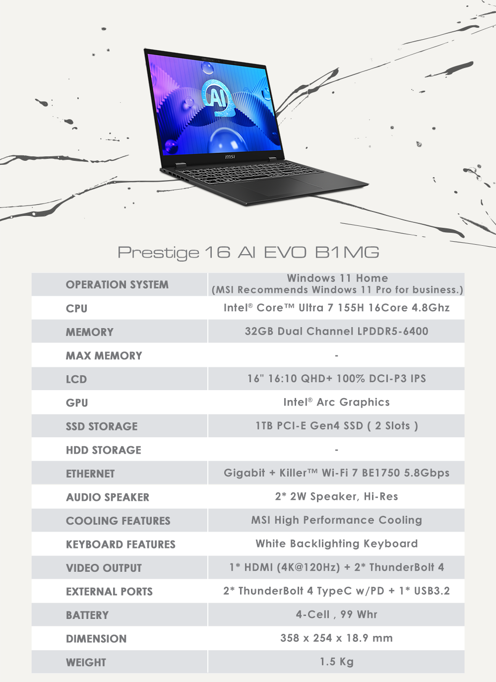 MSI Prestige 16 AI EVO B1MG 16吋 (2024) (Intel Ultra 7-155H, 32GB+1TB SSD) 商務級手提電腦