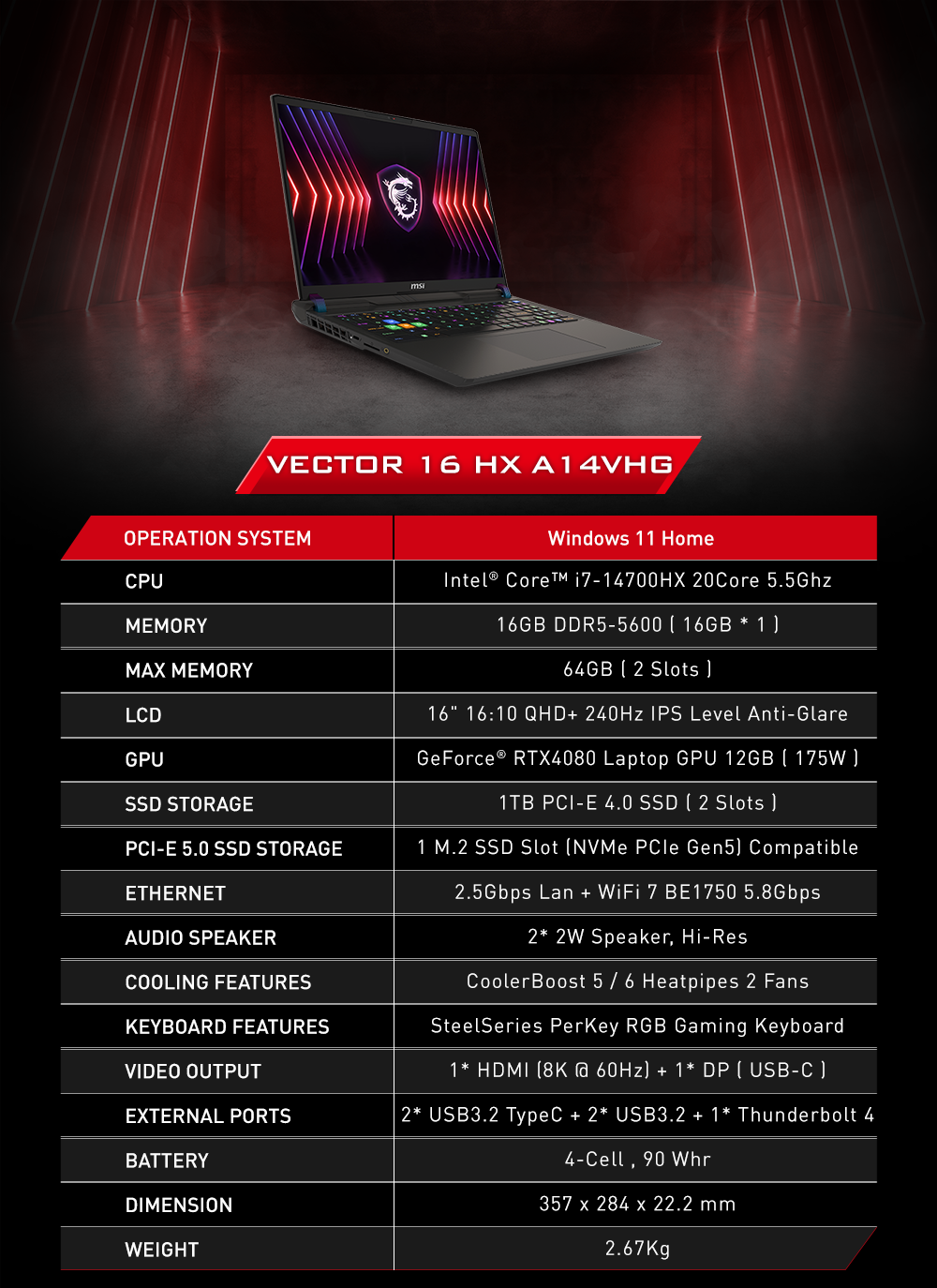 MSI Vector 16 HX A14VHG 16吋 (240Hz, i7-14700HX, 16GB+1TB SSD, RTX4080) 電競手提電腦