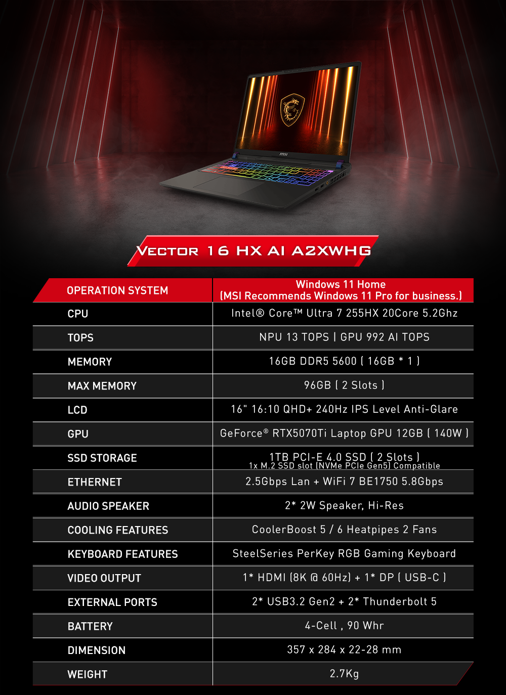 MSI Vector 16 HX AI A2XWHG 16吋 (2025) (240Hz, Intel Ultra 7-255HX, 16GB+1TB SSD, RTX5070Ti)電競手提電腦