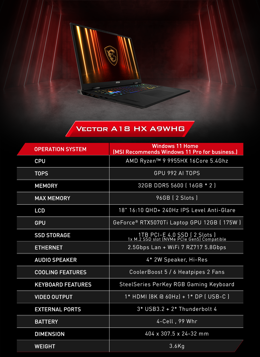 MSI Vector A18 HX A9WHG 18吋 (2025) (240Hz, R9-9955HX, 32GB+1TB SSD, RTX5070Ti) 電競手提電腦