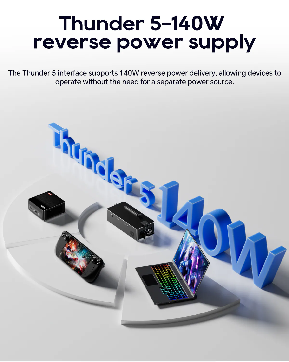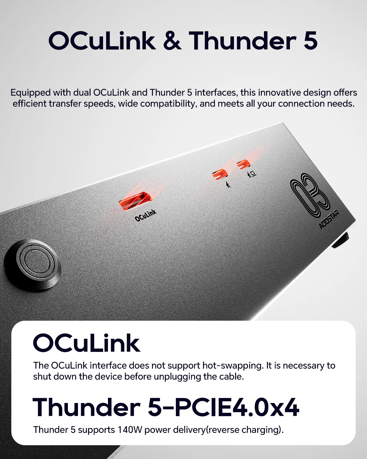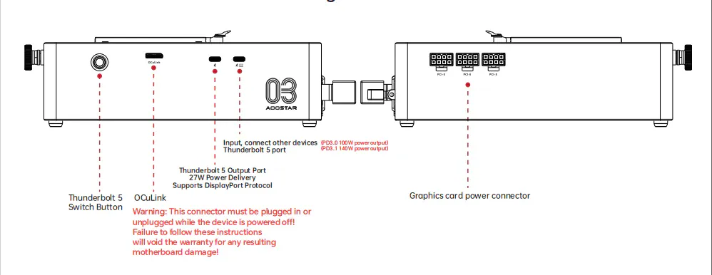 1 OCuLink interface, 1 TB5 Output with 27W PD, 1 TB5 Input