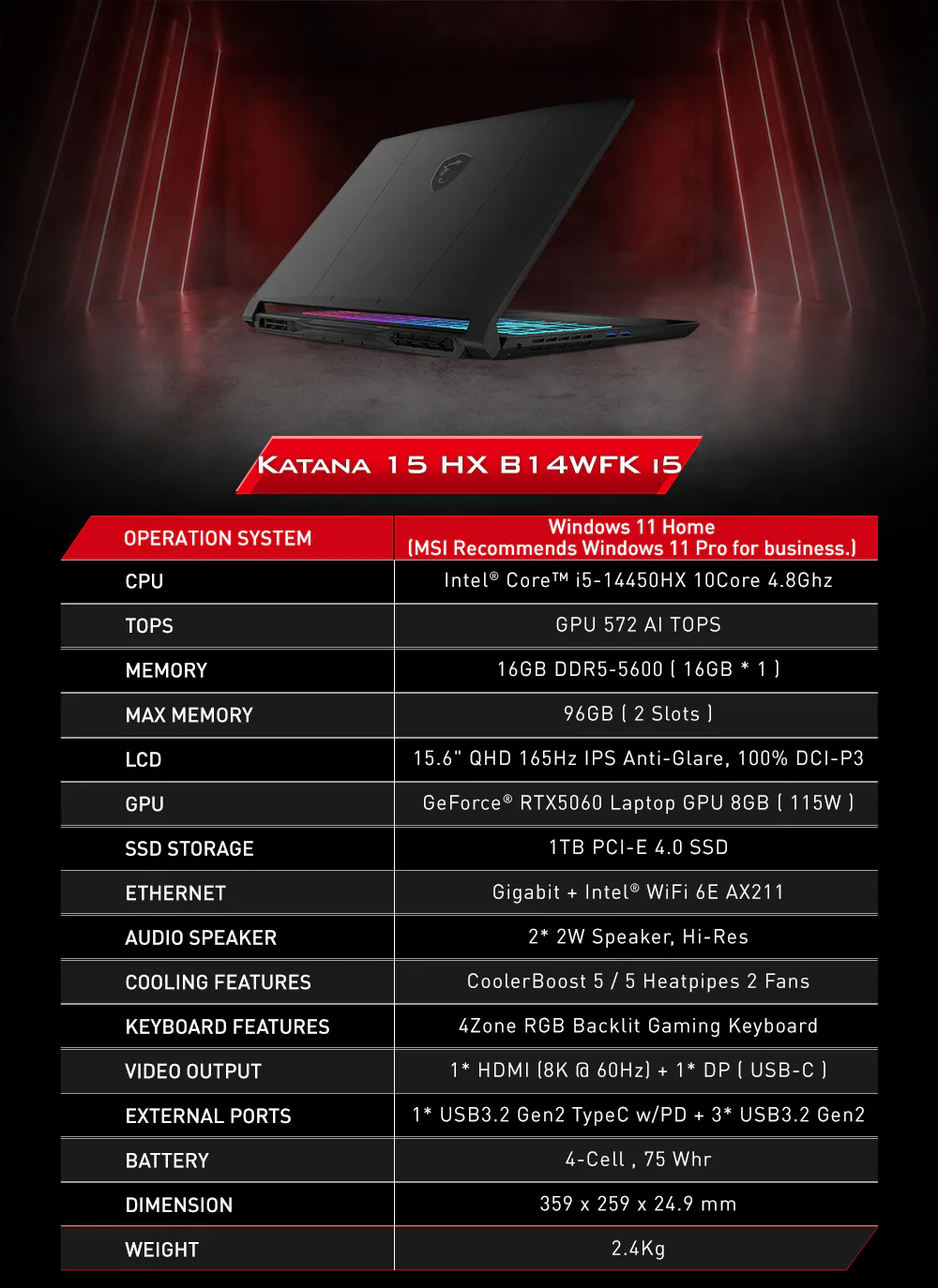 MSI 微星 Katana 15 HX B14WFK i5 15.6" 電競手提電腦 (i5-14450HX/RTX 5060/16GB RAM/1TB SSD)